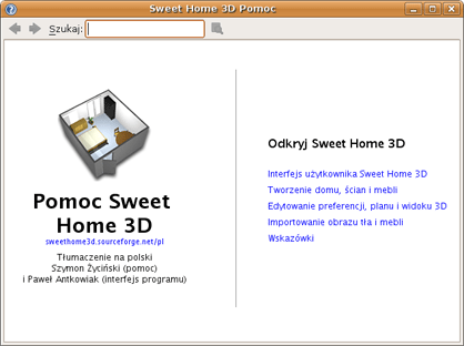 Program Sweet Home 3D zawiera pomoc, którą można uruchomić poprzez menu Pomoc > Sweet Home 3D Pomoc.