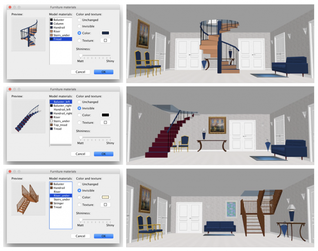 But the staircases added in the furniture library 1.6 offer more customization: the color and texture of their different parts (baluster, handrail, riser, tread…) can be modified separately using their Furniture materials dialog box displayed with the Modify button of their modification pane. From version 5.2, you can even hide some parts of a staircase using the new Invisible option available for each material, as shown in the following examples.