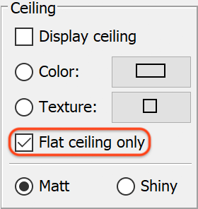 To avoid this behavior, the Flat ceiling only check box was added to the room modification dialog box to prevent Sweet Home 3D from trying to compute such slopping ceilings. By default, a new room will have this option checked, i.e. the elevation of its ceiling will be located at the highest wall if the room is at the last level. If you want to try the slopping ceiling feature, just uncheck it.