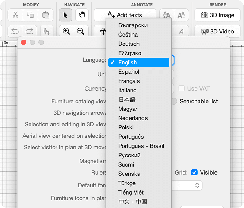 Scegli la lingua visualizzata nell’interfaccia utente di Sweet Home 3D e la sua ricca guida tra 29 lingue.