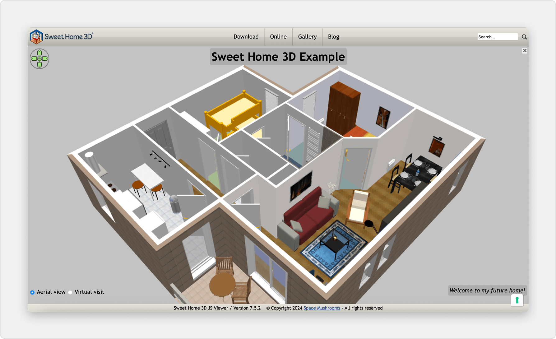 Na podlagi vtičnika za izvoz v HTML5 ta storitev registriranim uporabnikom omogoča nalaganje njihovih datotek Sweet Home 3D na ta spletni strežnik, da si jih lahko ogledajo v 3D načinu v katerem koli brskalniku, ki podpira WebGL, kot v tem primeru, prikazanem na spodnji sliki zaslona, ki prikazuje datoteko SweetHome3DExample3.sh3d, ki je na voljo v galeriji.