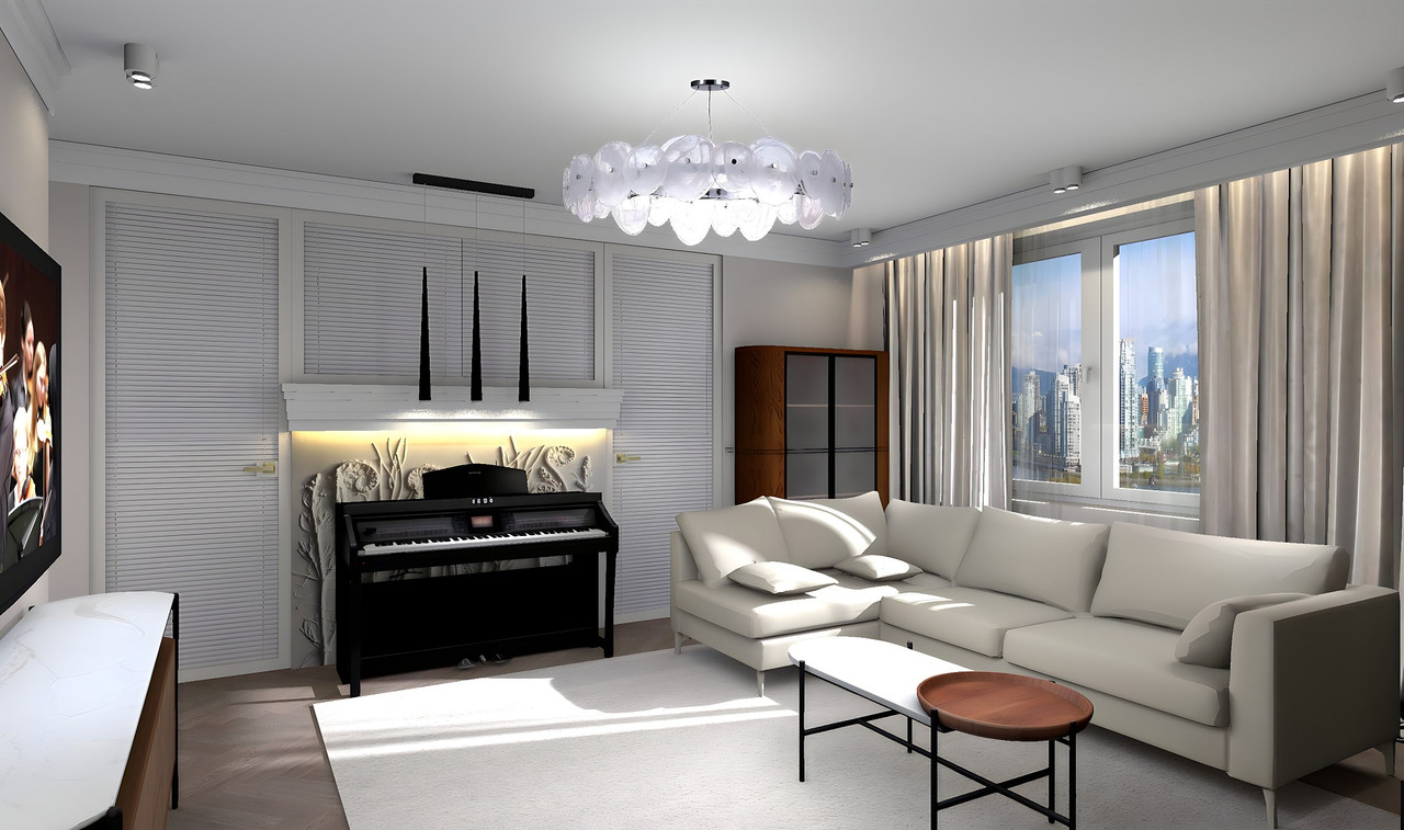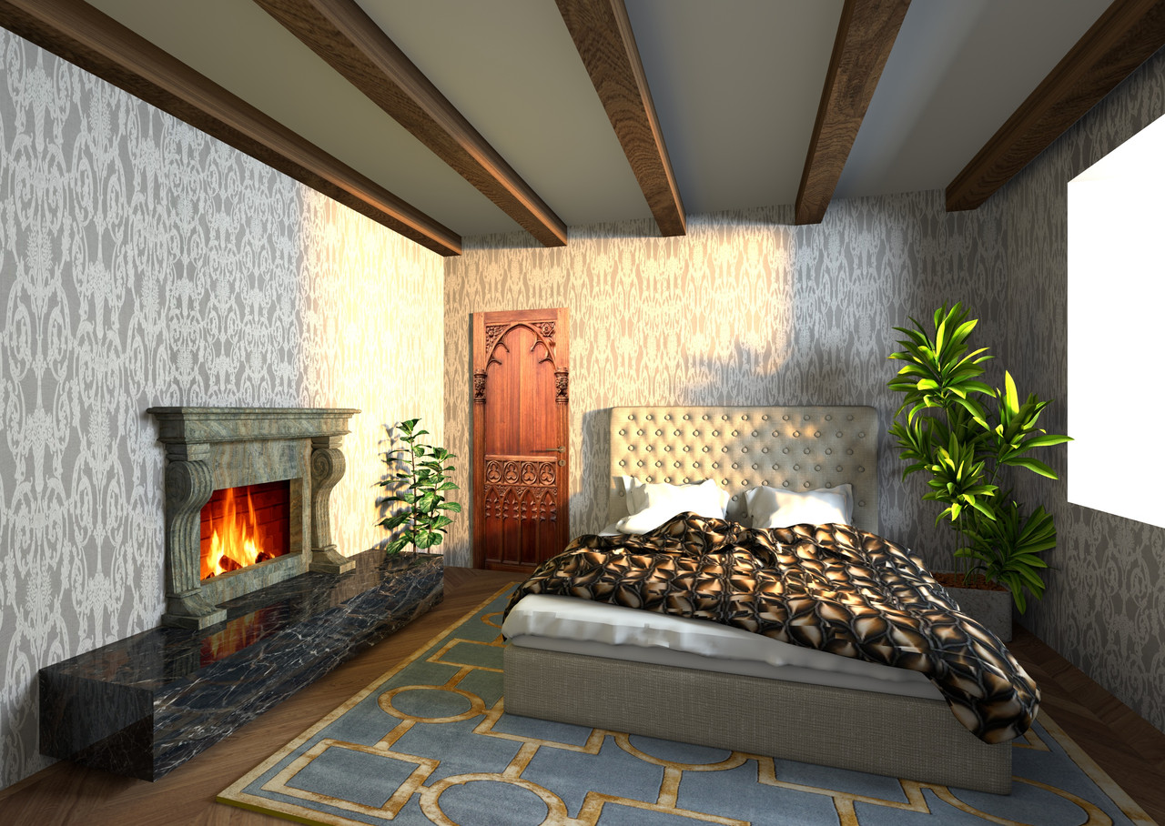 The rendering mode is standard, 4k + Glossy, 3000 pixels, 3D view. I tried to apply the Pathtracing + Silk mode. But I couldn't achieve good quality. there is a strong grain in the shady areas. Therefore, the reflection in the dark marble by the fireplace is very sharp, as in a polished material, without moire edges. I can't use Pathtracing mode for complex interiors yet, it's a pity. But the size of the sun, 50cm, gives the desired effect (imitation) of diffraction and a complex play of color in the shadows is visible. I advise you to use this method, it allows you to fully control the lighting mode from the sun. If the color of the spheres is made white, you will get a daytime mode with a bright white sun. But then there won't be such a complicated trick of light. But there will be a contrasting sun without coloring, as at sunset in the evening. But such a sun can be placed low and let the light into the room far inside the room.