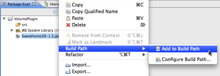 Utvecklingen av en plug-in baseras på vissa klasser av Sweet Home 3D som Eclipse måste känna till för att kunna bygga ditt projekt. Det enklaste sättet att lägga till Sweet Home 3D-klasser till Eclipse är att ladda ner JAR-körbara versionen av Sweet Home 3D som finns på https://sourceforge.net/projects/sweethome3d/files/SweetHome3D/SweetHome3D-7.5/SweetHome3D-7.5.jar/download. När du har laddat ner den, dra och släpp filen SweetHome3D-7.5.jar på projektikonen VolumePlugin i vyn Package Explorer i Eclipse, och välj objektet Build Path > Add to Build Path i den kontextuella menyn i filen SweetHome3D-7.5.jar, som visas i figur 2.