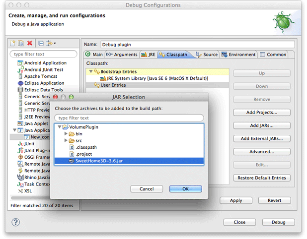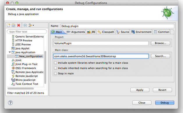 • Slutligen, klicka på knappen Debug för att starta Sweet Home 3D i felsökningsläge. När programmet körs, öppna filen VolumePlugin.java, ställ in en brytpunkt i metoden execute och välj Tools > Compute volume från Sweet Home 3D-menyn. Eclipse stannar vid den valda brytpunkten så att du kan köra programmet steg för steg och inspektera variablernas värde.
