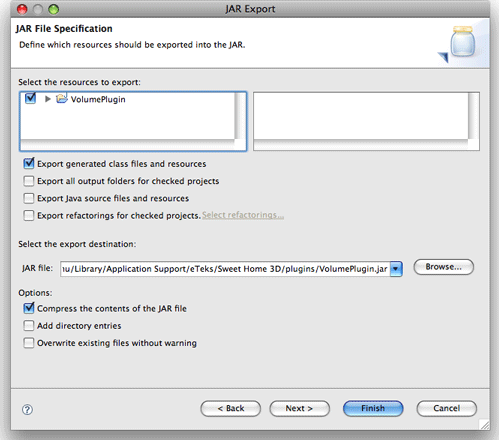 Plug-in-JAR innehåller class-filerna som skapats från kompileringen av filen VolumePlugin.java, och filen ApplicationPlugin.properties. Eftersom Eclipse kompilerar en Java-fil så fort du sparar den, behöver du bara välja File > Export… från menyn och välj Java > JAR file i dialogrutan Export som visas. I guiden Jar Export som visas som visas i figur 6, markera projektets kryss ruta och ange sökvägen till en JAR-fil som placeras i Sweet Home 3D-plug-in-mappen. Den här lämpliga mappen beror på ditt system enligt följande:
