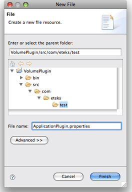 En ApplicationPlugin.properties fil beskriver plug-in-namnet, dess klass, de lägsta versionerna av Sweet Home 3D och Java som den stöds under, och juridiska saker. Välj File > New > File från Eclipse-menyn, ange filnamnet ApplicationPlugin.properties och klicka på Finish, som visas i figur 5.