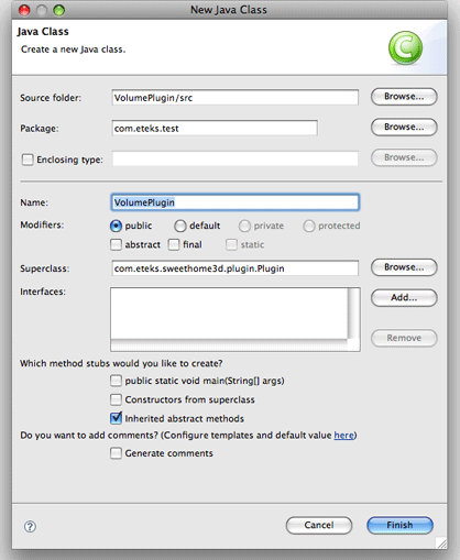 I dialogrutan New Java Class anger du VolumePlugin som klassnamn, anger ett paket (här var det valda paketet com.eteks.test) och väljer com.eteks.sweethome3d.plugin.Plugin som superklass för VolumePlugin. När du är klar klickar du på Finish. Eclipse skapar filen för den nya klassen med följande innehåll: