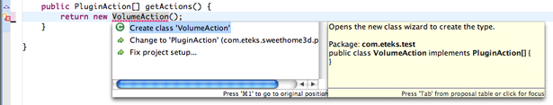 Skapa först en ny underklass av com.eteks.sweethome3d.plugin.Plugin genom att välja menyalternativet File > New > Class i Eclipse.