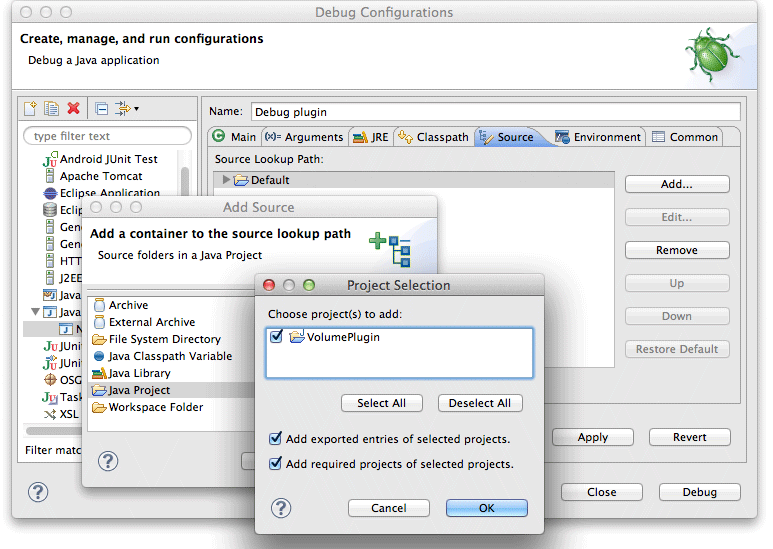 • Välj fliken Source, klicka på knappen Add…, dubbelklicka på objektet Java Project i dialogrutan Add Source, välj objektet VolumePlugin i popup-fönstret Project Selection och bekräfta ditt val.