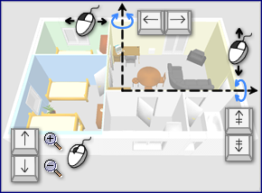 在繪製房屋圖的過程中,您可以隨時變更 3D 視圖中使用的視角。有兩種不同的房屋視圖可供選擇,預設選擇的模式已設定為3D 視圖。>鳥瞰圖選單和其他模式均已設定3D 視圖>虛擬訪問。在兩種模式下,您都可以使用滑鼠或鍵盤方向鍵來改變目前視角,如圖 16 和圖 17 所示。