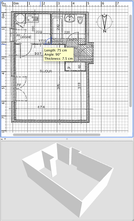 繪製牆壁時無需考慮門窗的位置,因為Sweet Home 3D會自動計算牆上開口的位置。如圖 6 所示,牆體會在平面圖和 3D 視圖中同時繪製,您可以隨時按住滑鼠左鍵移動滑鼠來調整 3D 視圖中的視角