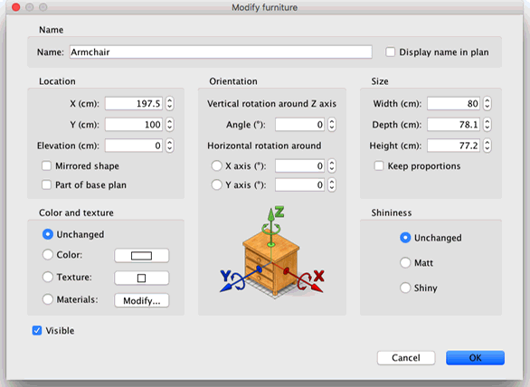 您也可以雙擊家具或選擇“家具”。>從選單中選擇「修改…」即可開啟家具對話框,修改目前選定的家具。如圖 10 所示,此對話方塊可協助您編輯所選家具的名稱、旋轉角度、位置、離地高度、尺寸、顏色或紋理、可見性以及是否鏡像其 3D 模型形狀。如果所選物件包含一個或多個燈光,此對話方塊還允許您編輯燈光強度,但此設定僅在照片建立面板中的兩個最高品質等級下有效。